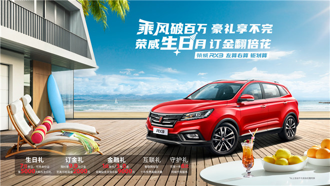 為慶?;ヂ?lián)網(wǎng)汽車銷量突破百萬大關,上汽榮威在“榮威寵你 月月有禮”用戶關懷計劃之后,再次加碼推出“乘風破百萬 豪禮享不完 榮威生日月 訂金翻倍花”的限時大促活動。即日起至8月31日,凡是8月生日的用戶(包括購車人親朋好友),購買榮威RX5 MAX、榮威RX5百萬款、榮威RX3、榮威i5、榮威i6 PLUS等任一款產品,均可享受巨額綜合優(yōu)惠。實惠和福利參見下表: